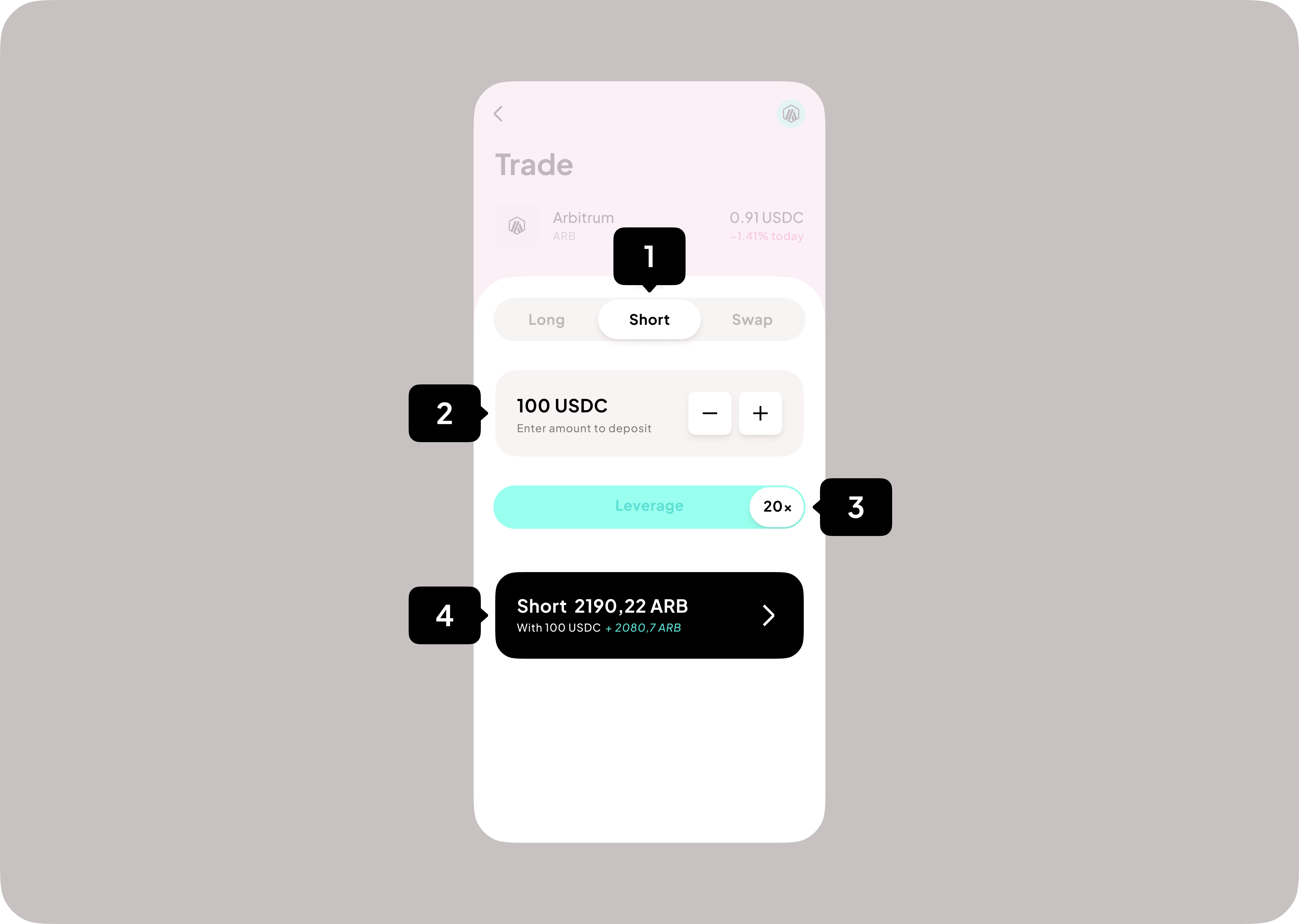 2. Click “Short” (1), input margin amount (2), choose leverage (3) and press Short button (4)